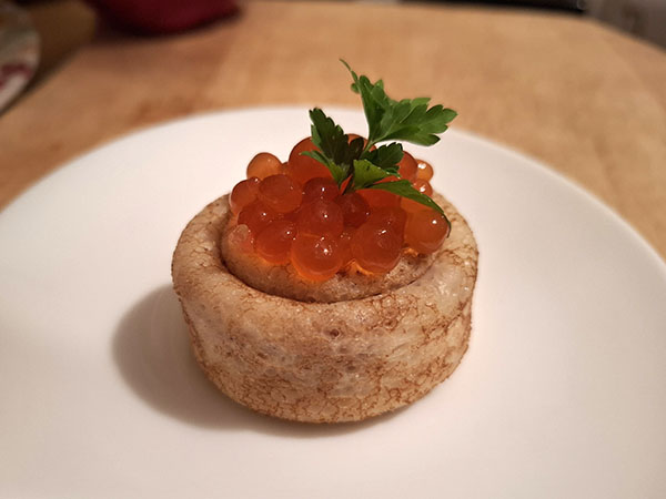 Красная икра - фаворит новогоднего стола. Можно подать на блинном рулетике. Блины печем чем тоньше, тем лучше, тогда закуска будет буквально на один-два укуса. Загодя достаем из холодильника творожный сыр, чтобы он согрелся и тонким слоем размазывался по блину, оставляя ровно посередине полоску без сыра с палец шириной. Разрезаем по ней блин пополам и скатываем в рулетик (от округлого края к прямому), а потом формируем улитку, край временно закрепляем зубочисткой. На такую улитку перед подачей на стол кладем ложку икры, украшаем зеленью.