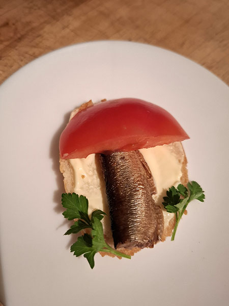 Бутерброды-грибки со шпротами или копченой салакой. Ломтик батона подсушить, смазать майонезом или смесью майонеза с творожным сыром. Шпроты промакнуть от масла бумажным полотенцем, удалить хвосты. Помидоры нарезать ломтиками. На бутерброде пристроить рыбку-ножку гриба и сверху помидорную шляпку. Если с точками из майонеза, будет мухомор, без - подосиновик. На одном бутерброде можно разместить пару грибков, если шляпки делать из черри, например.