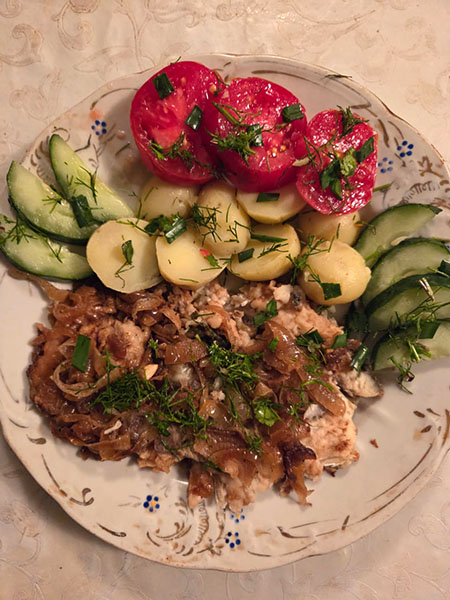 Последний день уходящего года мы «закрываем» рыбалкой. Далеко не едем, чтобы успеть вернуться к ночи, накрыть новогодний стол и начать прикладываться к накануне подготовленным селедке под шубой и оливье. И еще обязательно успеть приготовить наше дежурное новогоднее блюдо из свежего незамороженного улова. Это наш талисман, наш входной билет в новый рыболовный год. Готовлю его из любой рыбки любого размера. Получается очень быстро, если выпотрошенные и обвалянные в муке тушки слегка с двух сторон обжарить, а потом минут 15 томить на медленном огне под «шубкой» из лука и чеснока.