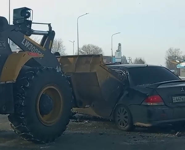 Фронтальный погрузчик въехал в легковой автомобиль в Костанае. Пострадал ребенок