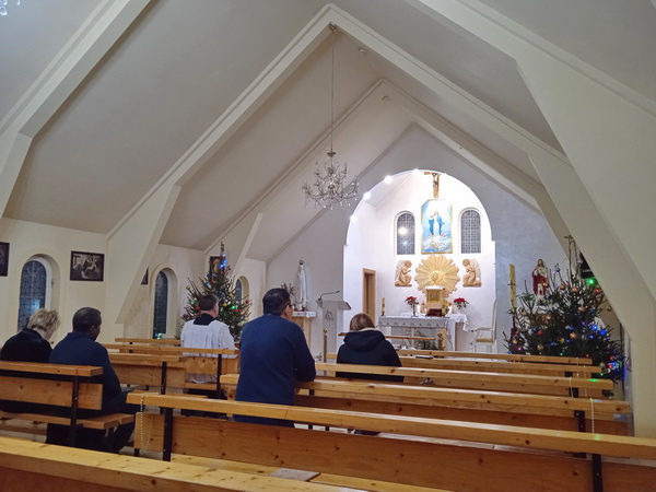 Отец Зигмунт вносит "младенца Иисуса" в композицию вертепа в начале богослужения / Фото предоставлено настоятелем прихода Успения Богородицы