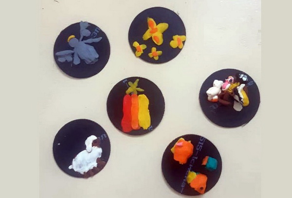 - А в этот вечер дети из нашего прихода делали поделки: им дали кружочки из чёрной бумаги, но ребята должны были добавить на них что-то, чтобы «рассеять тьму ночи». И видите что получилось! Там и свет звезды, и огонёк рождественского вертепа…