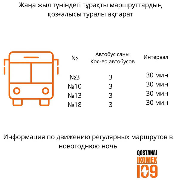 Как сообщает отдел ЖКХ, пассажирского транспорта и автомобильных дорог акимата Костаная на странице qostanai.ikomek, в новогоднюю ночь городские маршруты №№ 3, 10, 13, 18 будут курсировать до 22.00 и возобновят движение 1 января 2026 года с 00.30 до 3.00.