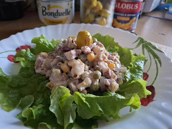 Сложив яблоко, огурец и лук в салатник, Ифтихор сбрызнул их 9%-м уксусом, Мэттью брал для этого яблочный. Я вообще обошлась, так как в конце салат заправляют лимонным соком. Дальше в миску пошли сладкая кукуруза, зеленый горошек и размятый вилкой тунец из банки. У меня был в масле, у них - в собственном соку. Но у меня масла оказалось совсем немного, думаю, на вкус это не повлияло. К продуктовому набору надо добавить еще готовой горчицы (у меня нашлась дижонская), слегка все посолить, выдавить сок половины лимона, заправить майонезом. Перемешать. Я подавала на листьях салата. Можно, наверно, и в тарталетки класть. Кстати, часть я съела, снимая пробу, а остальное доела часа через четыре. Вывод: настоявшийся салат вкуснее.