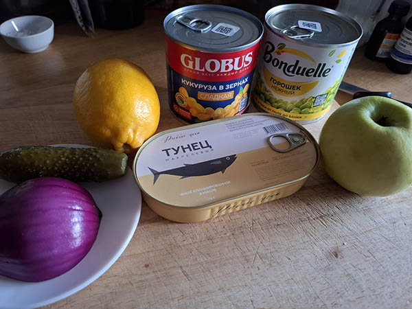 На 80 г консервированного тунца - 1 среднее зеленое яблоко, 1 средний маринованный огурец, половина небольшой красной луковицы, 2 ст. л. кукурузы, 2 ст. л. зеленого горошка, 1 ч. л. горчицы, сок 0,5 лимона, 2-3 ст. л. майонеза, соль - при необходимости.