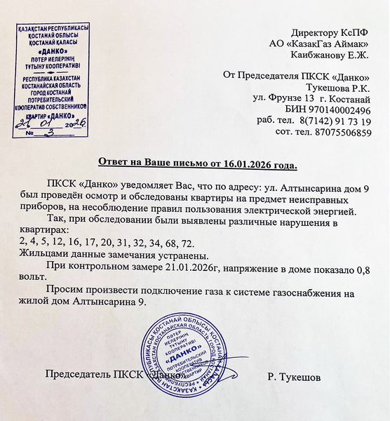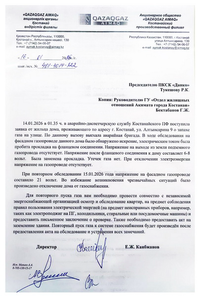 Но газ отключили не сразу. 16 января директор Костанайского филиала АО «QazaqGaz Aimaq» Ескендер Каибжанов пишет письмо председателю ПКСК «Данко» Рауану Тукешову, в котором сообщает, что выехавшая в ту ночь 14 января аварийная бригада не обнаружила ни электрического напряжения на выходе из земли подземного газопровода, ни утечек газа через фланцевое соединение (это то место, которое искрило и дымило), а вот при повторном обследовании 15 января всё нашлось – например, напряжение в 21 вольт на фасадном газопроводе. Газ отрубили, но только через день после тревожного сигнала.