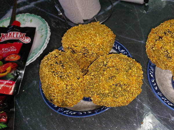 - Подготовленные бургеры окунаем в кляр так, чтобы он полностью покрыл заготовки, - пишет Елена, - потом обваливаем в панировочных сухарях, тоже стараемся, чтобы без пропусков, и жарим во фритюре до золотистой корочки 3-4 мин. Получается вкусно. Есть их удобно, разрезав пополам, добавляя различные соусы: соевый, терияки или сладкий чили.