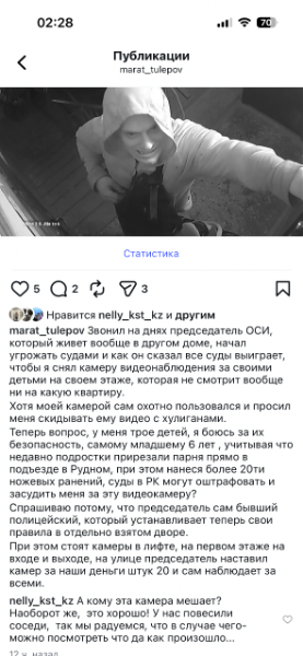 -Звонил на днях председатель ОСИ, который живет вообще в другом доме, начал угрожать судами и как он сказал все суды выиграет, чтобы я снял камеру видеонаблюдения за своими детьми на своем этаже, которая не смотрит вообще ни на какую квартиру. Хотя моей камерой сам охотно пользовался и просил меня скидывать ему видео с хулиганами.