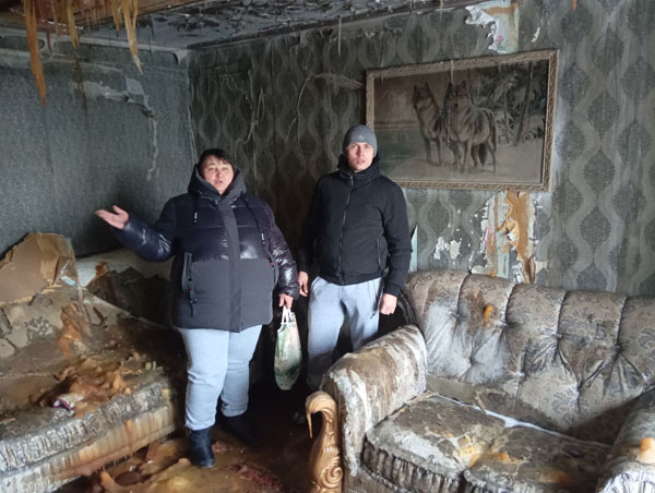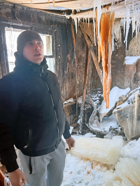 В то, что осталось от восьмиквартирного дома по ул. Молодежная, 9 в селе Жамбыл Костанайского района, мы вошли на свой страх и риск: пол и ступеньки в деревянном шпальнике подозрительно скрипят и трещат, а на втором этаже кое-где нет потолка. В других местах его доски провисли из-за массивных желтых сосулек - это следы пожаротушения в мороз. Запах гари на одежде, отпечаток непонимания на лицах: где нам теперь жить?