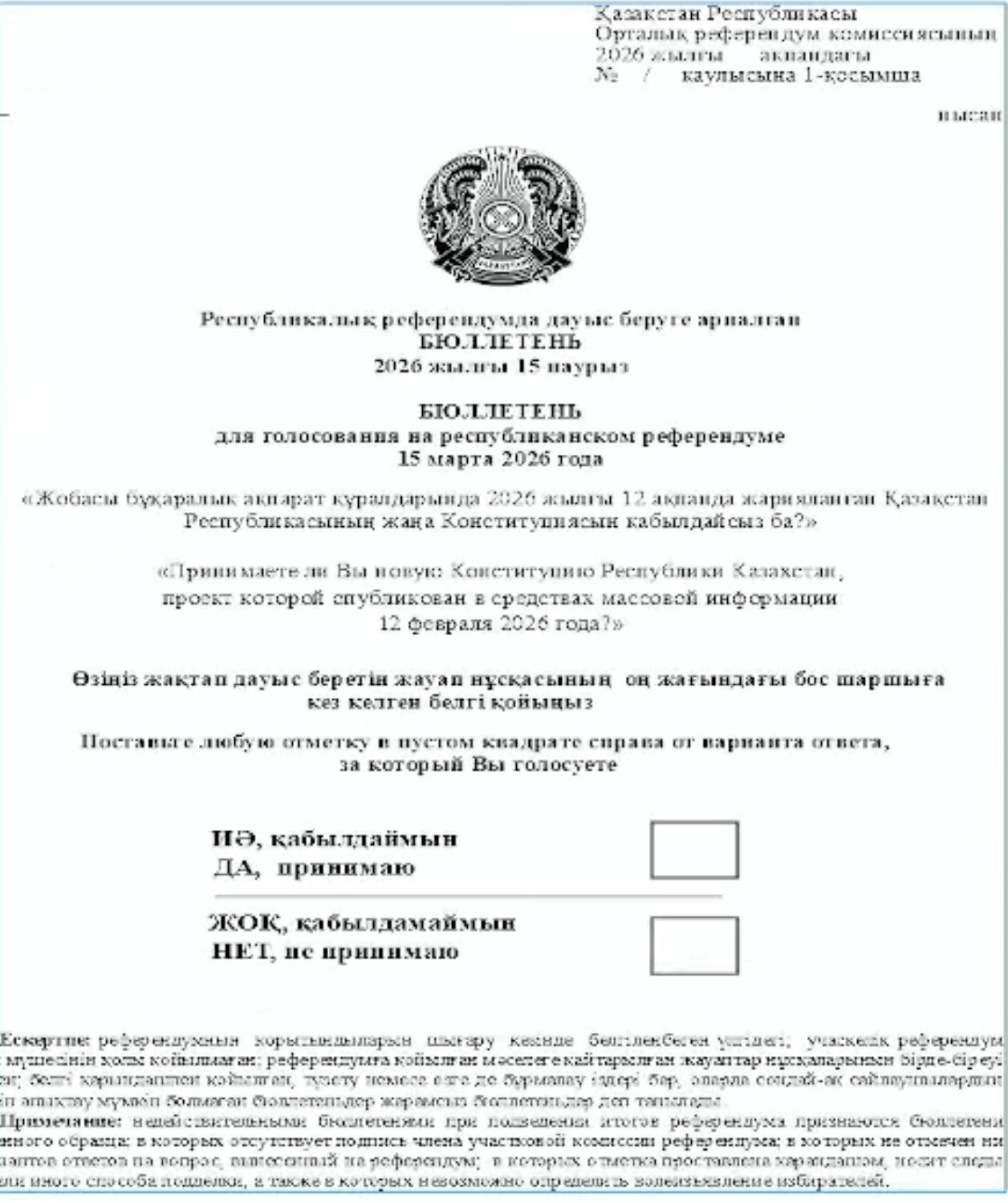 "Формулировка вынесенного вопроса: "Принимаете ли вы новую Конституцию Республики Казахстан, проект которой опубликован в средствах массовой информации 12 февраля 2026 года?" Варианты ответа: "Да, принимаю" и "Нет, не принимаю", — сообщил он.