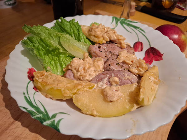 На сковороду, где обжаривалось мясо, отправить лук и на медленном жару довести до прозрачности. Вот дальше автор рецепта утверждает, что вместе с луком надо обжаривать пластинки яблок, потом туда же вливать сливки, добавлять горчицу и в финале в этом соусе прогреть пару минут медальоны.