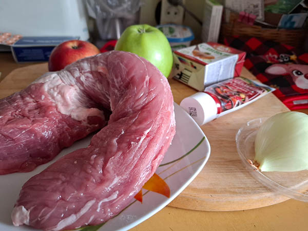 На 250-300 г вырезки - половина средней луковицы, 1 большое яблоко, 1ст. ложка готовой столовой горчицы (можно дижонской), 30-40 г сливочного масла, 2/3 стакана (как минимум) сливок.