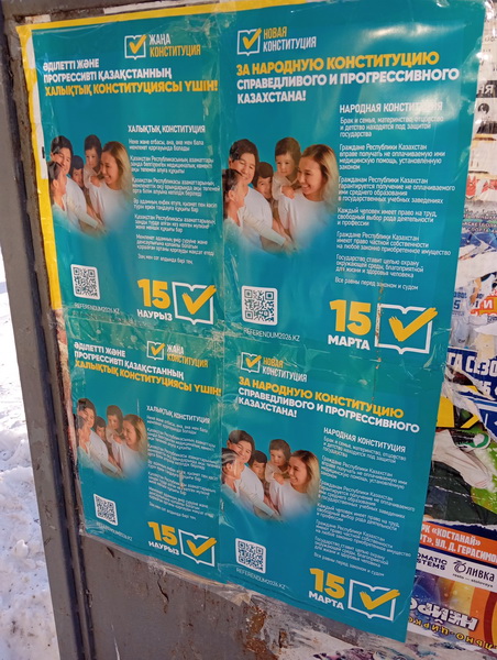 Вот фото счастливых членов условной семьи, а текст с перечнем некоторых положительных изменений в проекте Основного закона, как говорят, не оставляет альтернативы: «За народную Конституцию справедливого и прогрессивного Казахстана!» Стенд обклеен почти до земли - вероятно, чтобы посыл был заметен и самым маленьким.