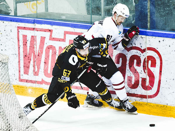 Борьбу за шайбу у заднего борта ведут защитник «Сарыарки» Ярослав Хрипков и нападающий «Горняка» Максим Мозжерин / Фото pro.ligasy.kz