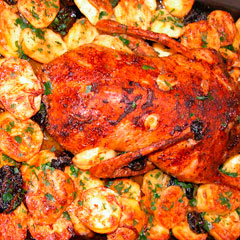 Теперь на противень стелите фольгу в два слоя так, чтобы еще и сверху можно было бы хорошо укутать утку. Ставим в разогретую до 220-250 градусов духовку на час. Потом открываем. Руками в кухонных рукавицах немного разворачиваем фольгу и протыкаем толстенькую ножку. Если сок еще с кровью, то надо вернуть фольгу на место и печь утку еще минут 20. Если нет, то фольгу надо отвернуть с тушки полностью и разложить на ней картошку. Несколько раз поливаем утку и клубни вытопившимся жиром, включаем духовку на максимум и ждем, пока и птица, и картошка станут золотистыми. Или зажарятся так сильно, как вы любите.
