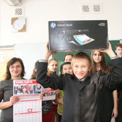 Самый большой вклад в нашу акцию в этом году внесли ученики школы № 17. Они собрали 202 сосны. Как только наш фотокорреспондент внес в здание школы большую коробку с призом - домашним мини-кинотеатром - в коридорах началось оживление.