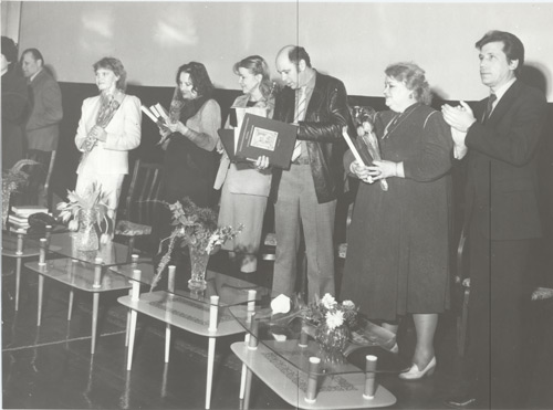 Актрисы Тамара Семина (третья слева), Наталья Крачковская (пятая) и сценарист Аркадий Инин (четвертый) на встрече в Лисаковске. 1984 г.