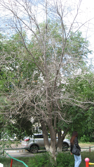 - Этот карагач является сухостоем прошлых лет, внутри давно живут насекомые.
