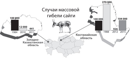 Это не первый мор сайгаков, но один из самых масштабных. Он тем обиднее, что из 5 стран в мире, где в разных количествах обитают эти антилопы, Казахстан в сохранение вида вкладывает беспрецедентно много. В уже упомянутом пресс-релизе говорится, что благодаря усилиям государства, которое поддерживают дружественные зарубежные фонды и организации, численность сайги в Казахстане увеличилась с 49 тысяч в 2006 году до 256,7 тысяч в 2014 году. За это время и площадь особо охраняемых территорий в стране выросла на 3 млн га. В 2012 году на 490 тыс. га земель запаса Амангельдинского и Жангельдинского районов Костанайской области был создан природный резерват «Алтын дала», так как те края - большой роддом для сайги Бетпакдалинской популяции, одной из трех казахстанских. Там и случился мор.
