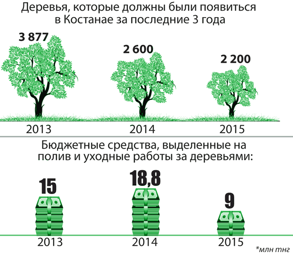 Только за последние 3 года в Костанае должно было появиться около 9 000 саженцев. Но ежегодно более 70% деревьев не приживаются, несмотря на то, что по статье «полив и уход за деревьями» тратятся бюджетные миллионы.