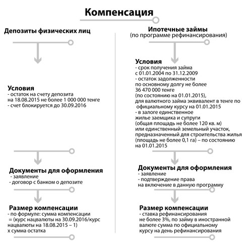- Когда к нам приходят клиенты, которые претендуют на получение такой компенсации, мы проверяем по базе данных, есть ли у них для этого основания, после чего они пишут заявление по установленной форме, и мы переоформляем депозит на получение компенсации, - сообщила Жумашева. - О сумме компенсации сейчас никто сказать не сможет. Она будет начисляться по формуле, в которой учтут соотношение курса тенге к доллару на 30 сентября 2016 года к курсу на 18 августа 2015 года.