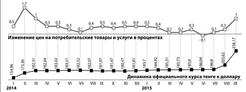 Сопоставление графиков изменения валютного курса тенге и динамики потребительских цен показывает, что в период девальвации цены начинают галопировать, но затем «успокаиваются» и могут даже изменяться со знаком минус. На их динамику влияют какие-то другие факторы. «Замораживанием» счетов при компенсации государство в определенной степени «повяжет» на год огромную сумму денег. Эта мера должна сдержать инфляцию. Не будет в ближайший период и ощутимого роста зарплаты. Снижение покупательского спроса - сдерживающий фактор для увеличения цен.