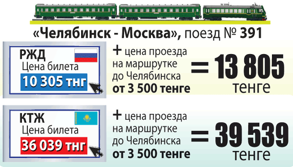 В том, что это так, сомнений нет. Но обращает на себя внимание разница в ценах у казахстанских и российских железнодорожников. Зайдите поочередно на сайты РЖД и КТЖ, впишите в окошко поиска искомый маршрут (один и тот же) и оцените разницу в ценах на билеты. Мы оторопели, когда ее увидели, например, желая уехать из Челябинска в Петербург.
