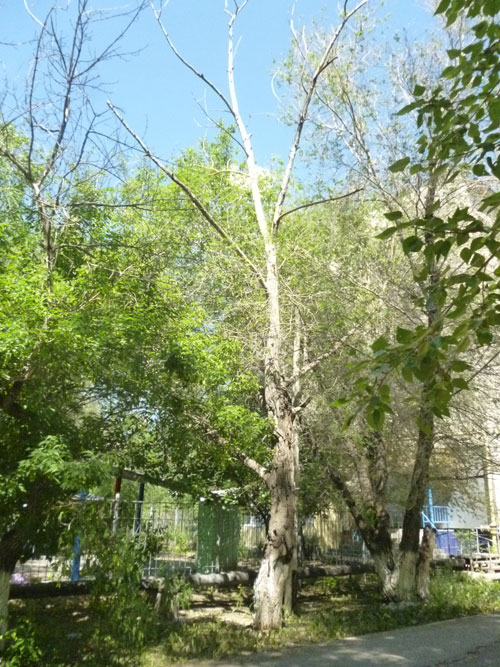 На отрезке улицы Козыбаева - между проспектом Аль-Фараби и улицей Тарана - в Костанае есть тихая аллея, по которой приятно пройти жарким летним деньком. Высокие тополя, обрамляющие пешеходную дорожку, дают столь желанную тень, здесь всегда хочется замедлить шаг. Но на этой милой аллее, возле забора детского сада № 44, есть два тополя, отжившие свое.