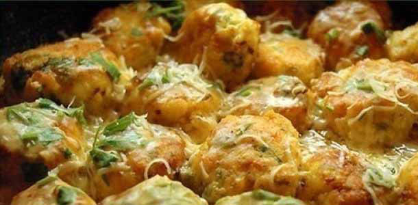 В глубоком противне разместите фрикадельки. Сделайте заливку из сливок, в которые добавлен порошок карри и тертый сыр. Залейте шарики, запекайте 10-15 минут.