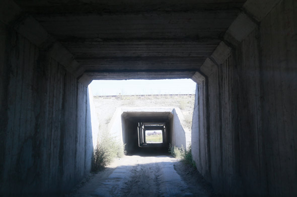 Аналогичная ситуация с незапланированным окольным путем сложилась при подъезде к путепроводу со стороны Лисаковска. Опять-таки, чтобы не делать 12-километровый круг по официальному пыльному грейдеру, водители проторили дорожку через поворот на село Приозерное. Объездная частично проходит почти в интимной близости и с домами станции Тобол, поэтому кое-где жители сами положили кирпичи и бетонные ограждения. Через несколько витиеватых поворотов дорога ныряет в туннель, расположенный под железнодорожными путями и явно не предназначенный для проезда, а выныривает на узком проезде рядом с элеватором... Ощущения - почти как после американских горок с той разницей, что на тобольских вам никто не гарантирует безопасность. Апофеозом такого дорожного экстрима можно назвать плакат с надписью «Экспо - энергия будущего», который висит на стенде недалеко от элеватора и лучезарно встречает водителей и пассажиров после тряски.