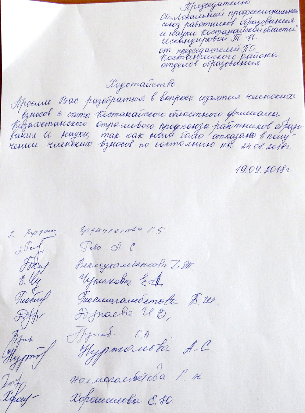 Такие письма Айгуль Тулюбаева разослала председателям первичных организаций