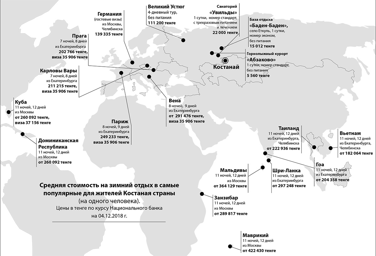 Первое, о чем нам сразу сообщили в большинстве туристических агентств, - активный отдых на лыжах в горах или на песчаных пляжах в разгар костанайской зимы давно не всем по карману. Времена, когда наши граждане так называемого среднего достатка могли позволить себе махнуть на длинные выходные в Финляндию, чтобы прокатиться по первому снегу или купить недельный тур на отдых в Швейцарию, закончились после очередной крупной казахстанской девальвации в 2015 году. Сейчас одними из самых доступных, а потому популярных направлений для костанайцев среди стран дальнего зарубежья являются Германия и Чехия, иногда Франция и Австрия.