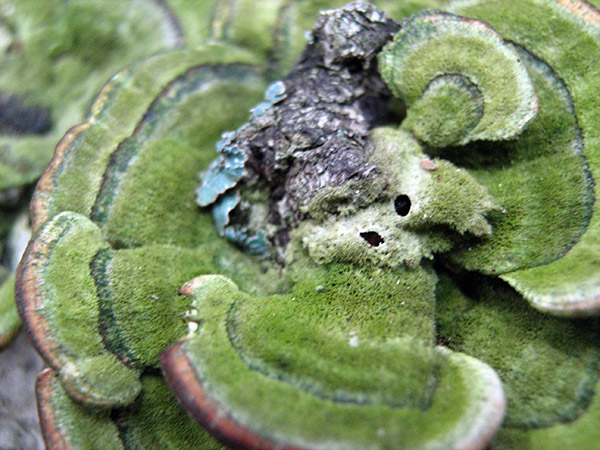 Зеленость стереуму нежно-войлочковому придают растущие на его поверхности водоросли. Чем ближе к земле, тем зеленее гриб