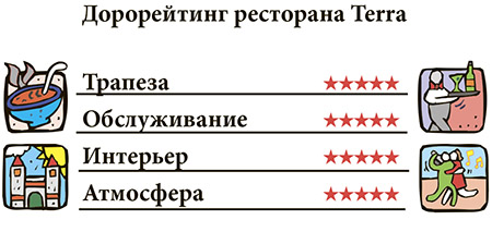 Зал, безусловно, хорош. Не гламурный, без избыточного украшательства, но с запоминающимися деталями. Я лично буду ассоциировать «Терру» с черной головой быка в холле и с огромной бутылкой-колбой зеленого стекла. Она переливалась на подоконнике и веселила меня мыслями о том, сколько дачной наливки могло бы войти в такой изумительный сосуд.