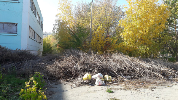 Как в насмешку, очень старые клены перед этим средоточием бардака кронированы - стоят пни и бревна с жалкими пучками зелени.