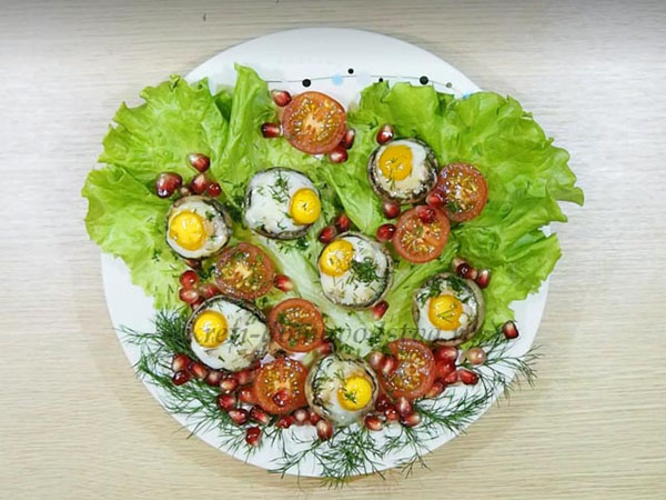 Для начинки: мелко нарежьте ветчину, готовую куриную грудку, можно что-то из копченостей. Можно микс сделать. В шляпку кладите по ложечке мясопродуктов, по ложечке сливок, немного твердого сыра, натертого на мелкой терке. А затем в каждую шляпку выпускаете перепелиное яйцо, которое сверху можно посыпать сладкой паприкой. Для красоты и яркости. Фаршированные грибы запекаются 15 минут при температуре 180 градусов, форму смазать растительным маслом. Если вы используете твердый сыр, то подавать такую закуску нужно теплой.