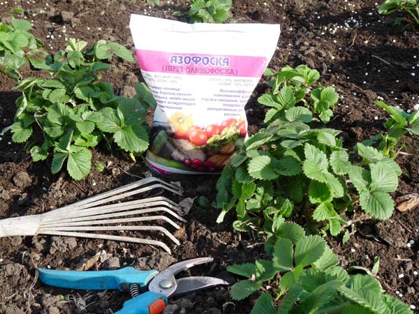 Внесение удобрений стоит проводить дважды и совместить с рыхлением. В первую очередь для активного наращивания зеленой массы требуется азот. Поэтому стоит применять удобрение с большим его содержанием. Это может быть аммиачная селитра, карбамид (норма расхода 2 ст. ложки на 1 кв. м) либо комплексное удобрение для земляники или азофоска (согласно инструкции). Гранулы заделайте в почву на глубину 5-7 см и обязательно полейте водой. Из органических удобрений земляника отзывчива на внесение хорошо перепревшего навоза или богатого быстродоступным азотом куриного помета, из которого готовят раствор: 1 кг сухого помета заливают 10 л воды и настаивают 3 дня. Каждый литр такого раствора разводят в 5 л воды и поливают землянику из расчета 0,5 л под один куст.