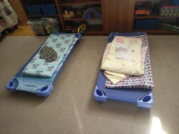 В детском саду нет отдельной комнаты для сна. На ковер ставят маленькие раскладушки