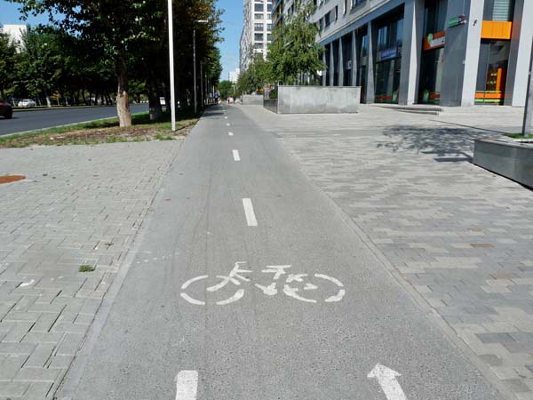 Тюмень по компактности схожа с Костанаем: плотная застройка, узкие дороги, особенно в старой части города. Здесь много улиц с зеленой разделительной полосой и односторонним автомобильным движением. На некоторых центральных транспортных артериях города тротуар делится на пешеходную часть и велодорожку, которая выделена разметкой и знаками.