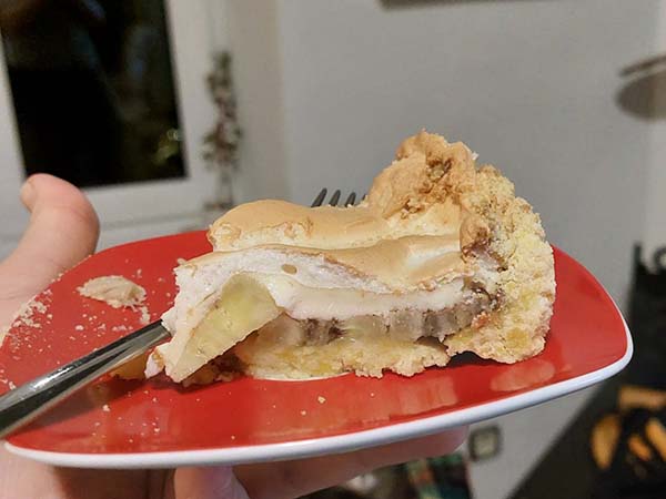 Для теста: 100 г сливочного масла, 2 ст. л. сахара, ½ ч. л. соли, 300 г муки , 1 ч. л. разрыхлителя, 3 желтка. Для начинки: 2-3 спелых банана, 250 г сметаны, 3 белка, 0,5 стакана сахара.