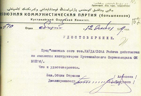 Удостоверение инструктора окружного женотдела Рабичи Кайдауловой. 1929 г.