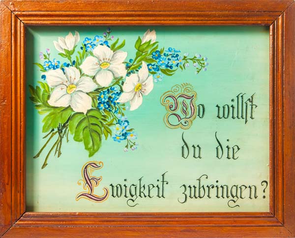Рисунок маслом на фанере. Цветы, похожие на эдельвейсы, и цитата из Библии: Du führest dein Volk wie eine Herde Schafe («Как стадо, вел Ты народ Твой»). В православной нумерации это Пс. 76:21, в Библии Лютера - Ps. 77,21. Безукоризненный строй букв, автор явно владел шрифтовой графикой и знал толк в трех готических изводах.