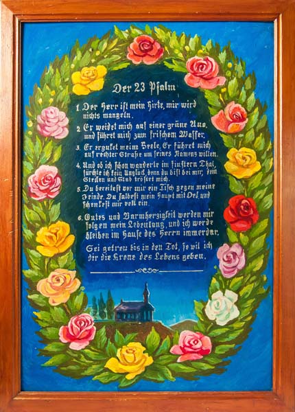 Панно с изображением венка из роз с ночным пейзажем и текстом 23-го псалма (в масоретской нумерации, в греческой он 22-й. Протестанты используют масоретскую нумерацию, католики - греческую). Псалом положили на музыку Иоганн Себастьян Бах, Леонард Бернстайн, Франц Шуберт, Антонин Дворжак; его включали в свой репертуар Дюк Эллингтон, Moody Blues, Pink Floyd, E Nomine. Под текстом псалма цитата из Евангелия: Sei getreu bis an den Tod so will ich dir die Krone des Lebens geben («Будь верен до смерти, и дам тебе венец жизни», Откр. 2:10). Использовалось в лютеранской общине Лисаковска.