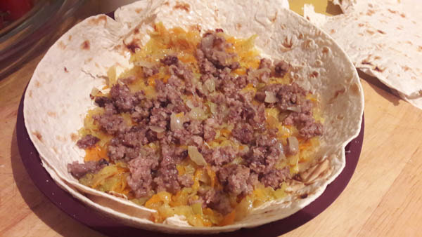 На 1,5 круга лаваша диаметром 25 см - 300 г тушеной капусты, 170 г жареного смешанного фарша, 2 яйца, ½ ст. молока, 1 ст. ложка с горкой сметаны