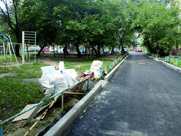 На месте корреспонденты «НГ» увидели мешки со строительным мусором недалеко от спортивной площадки и на тропинке посреди двора.